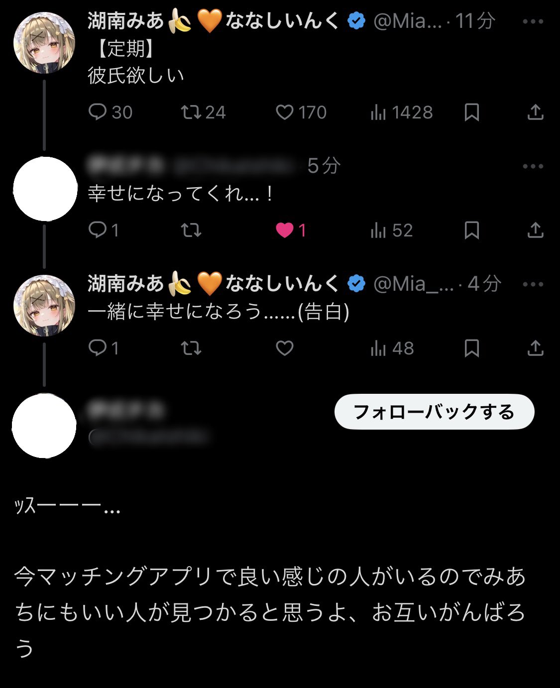 彼氏欲しい— 湖南みあ🍌🧡ななしいんく (@Mia_Konan) October 16, 2024
