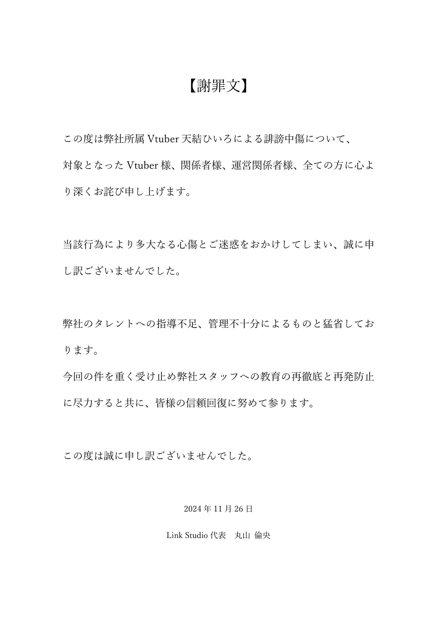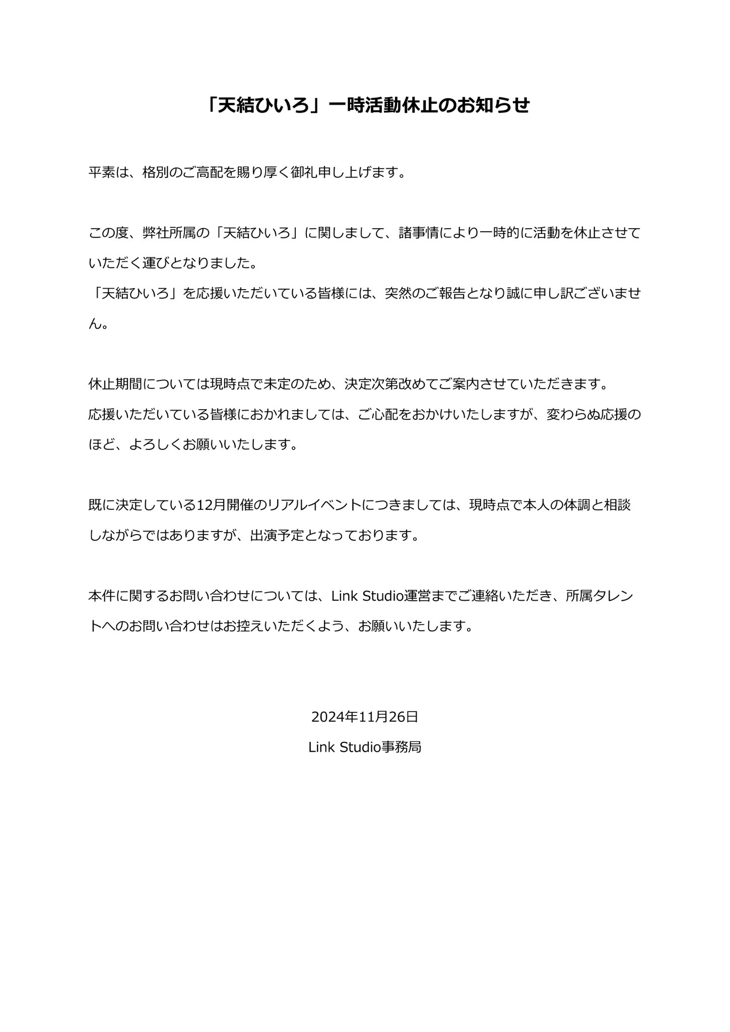 Vtuber事務所「Link Studio-V」、メンバーの天結ひいろさんが諸事情により活動休止になることを報告(午前9:28 · 2024年11月26日)