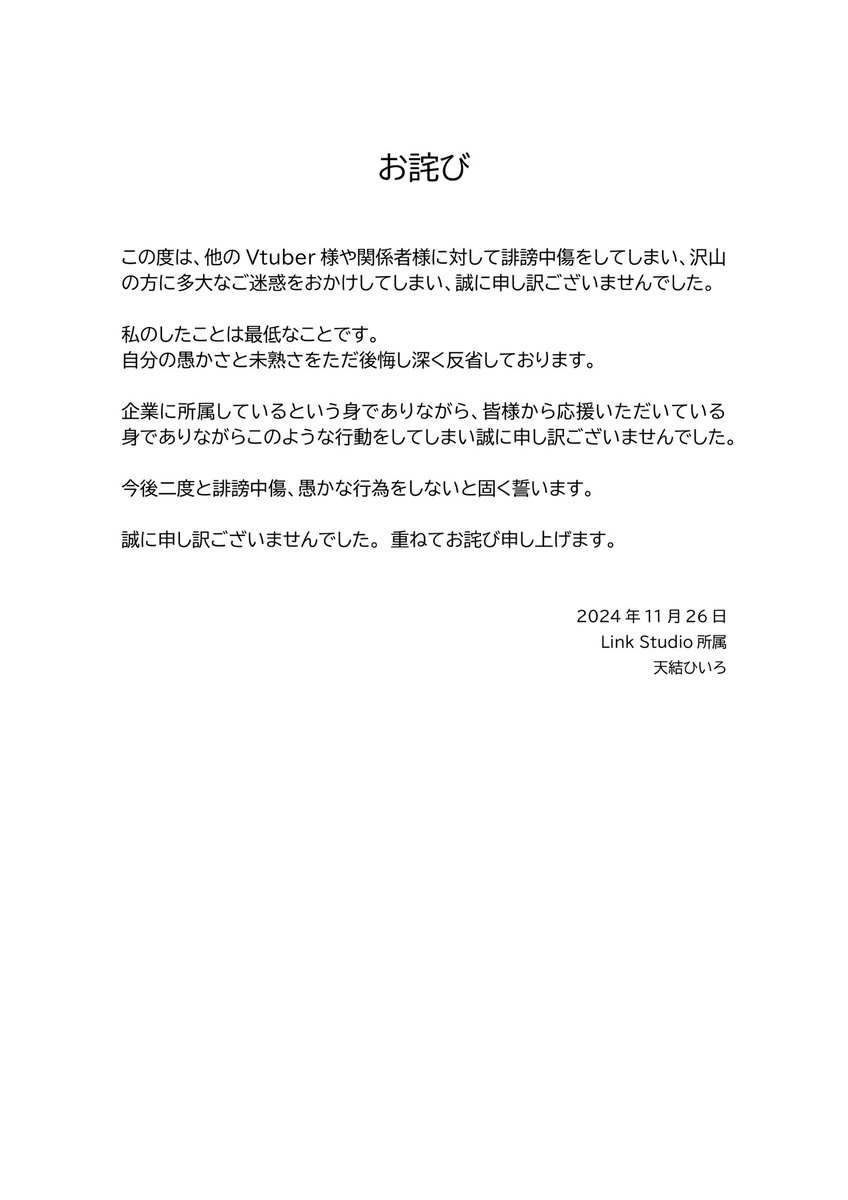 天結ひいろさん、謝罪(午後8:21 · 2024年11月26日)