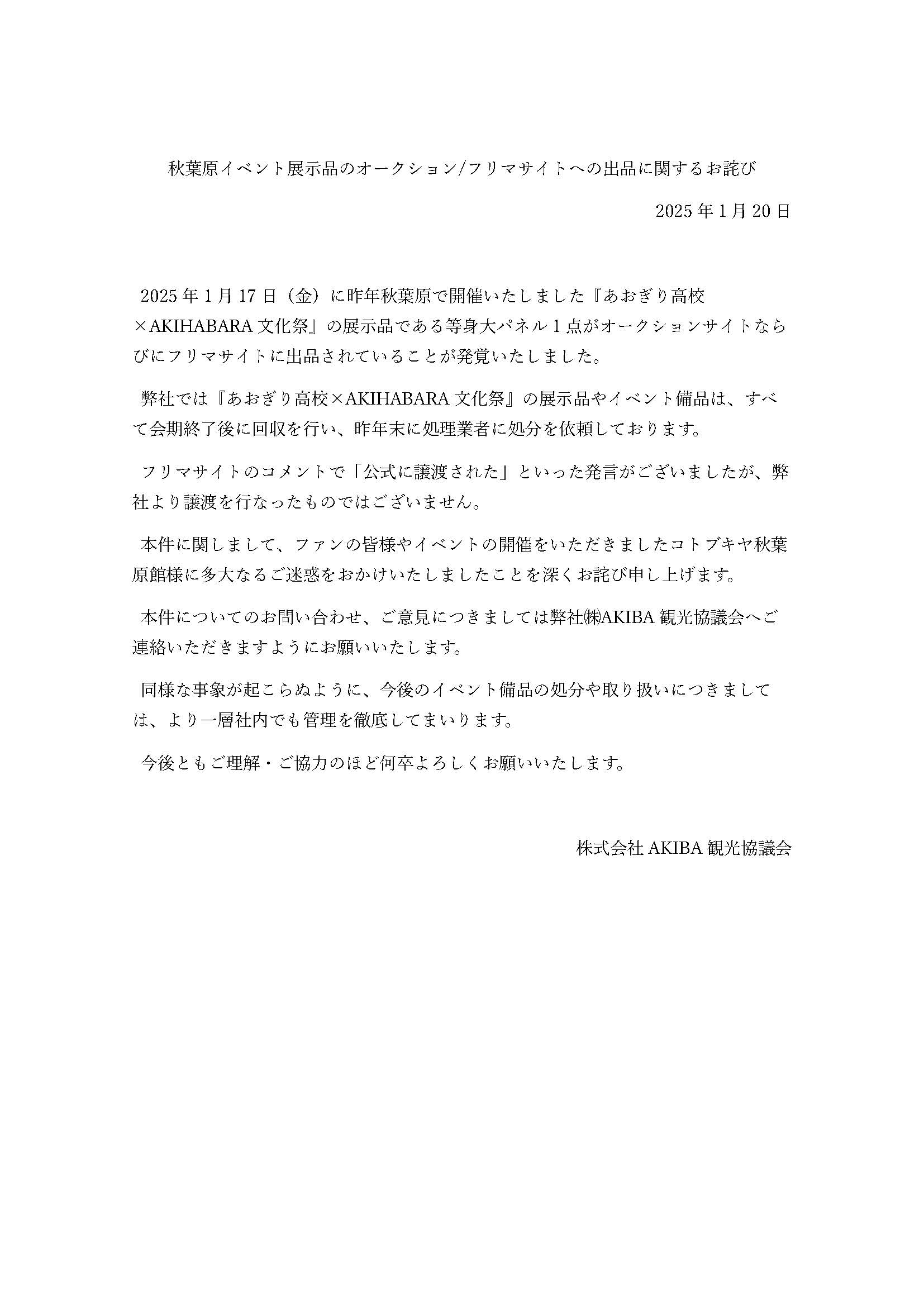 この度は「あおぎり高校×AKIHABARA文化祭」の展示品がフリマサイトに出品されている事象に関しまして、ファンの皆様、イベント実施店舗様に多大なご迷惑をおかけいたしまして誠に申し訳ございません。 pic.twitter.com/GRkk5wXZjX— あきじゃぱ(AKIHABARA JAPAN)秋葉原イベント情報 (@Akihabara_Japan) January 20, 2025