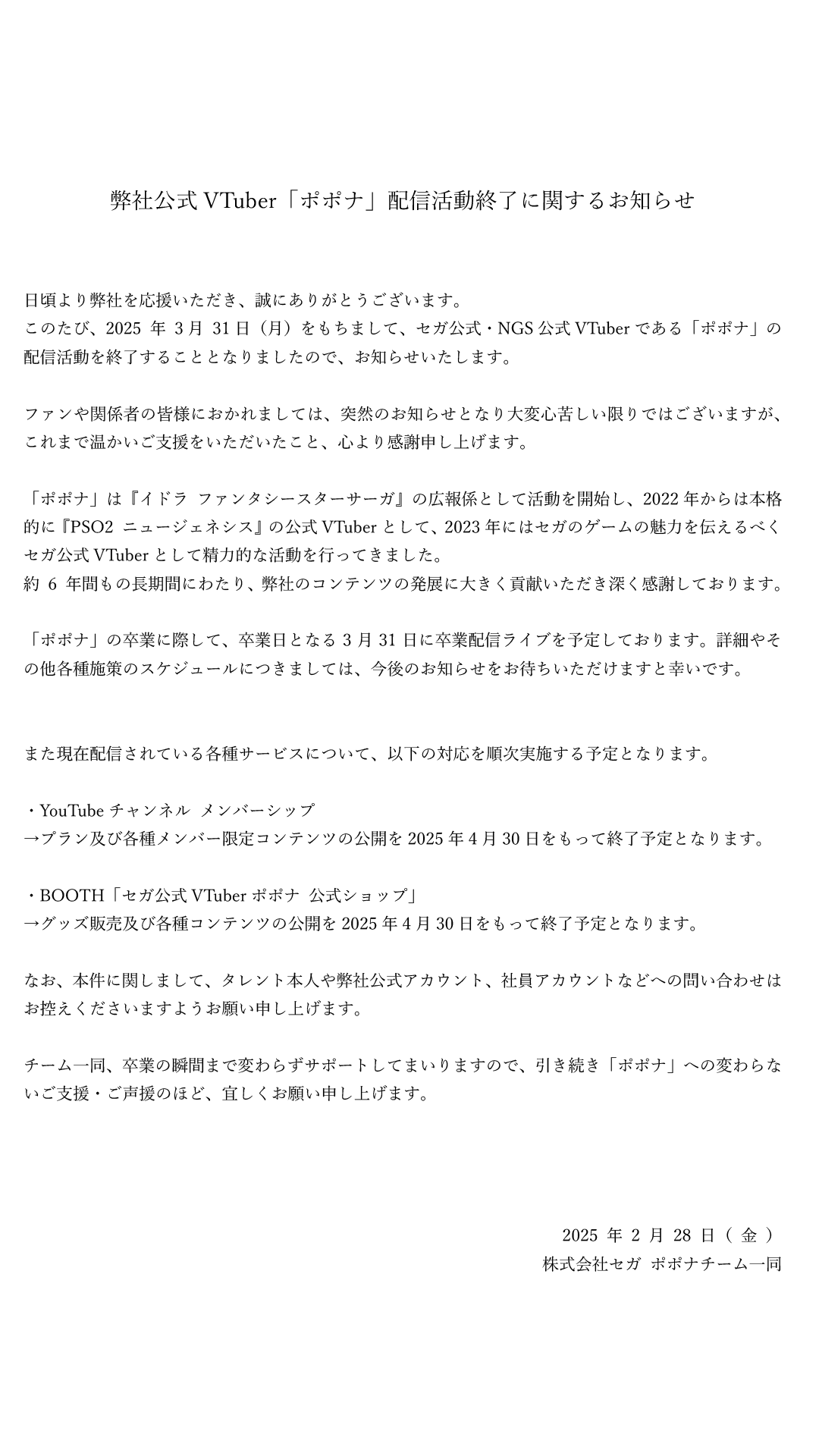 【スタッフよりセガ公式VTuber「ポポナ」配信活動終了に関するお知らせ】 pic.twitter.com/2OyO8gRVaT