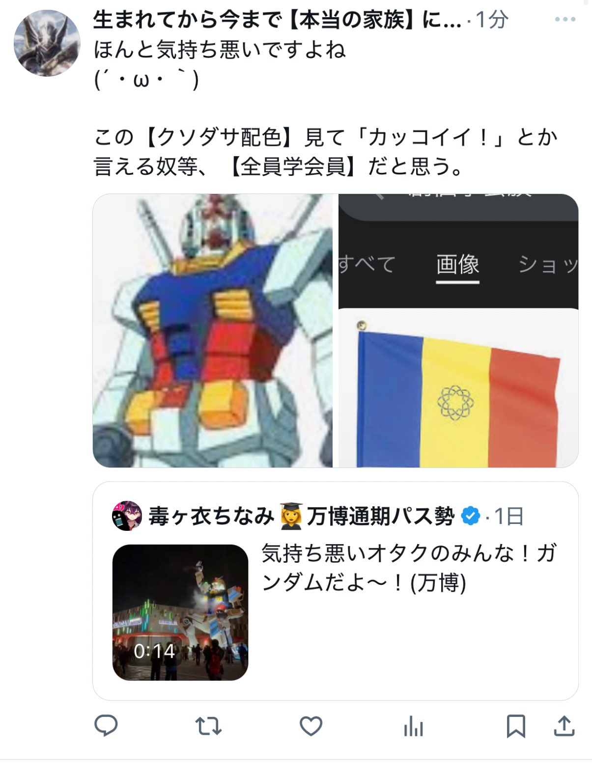 万博ツイート、どれくらい陰謀論者に突っかかられるかというと「ガンダムの色味は創価学会の色味と同じだ!」くらいの反応がめちゃくちゃ来ます pic.twitter.com/GiWV3GxzKJ