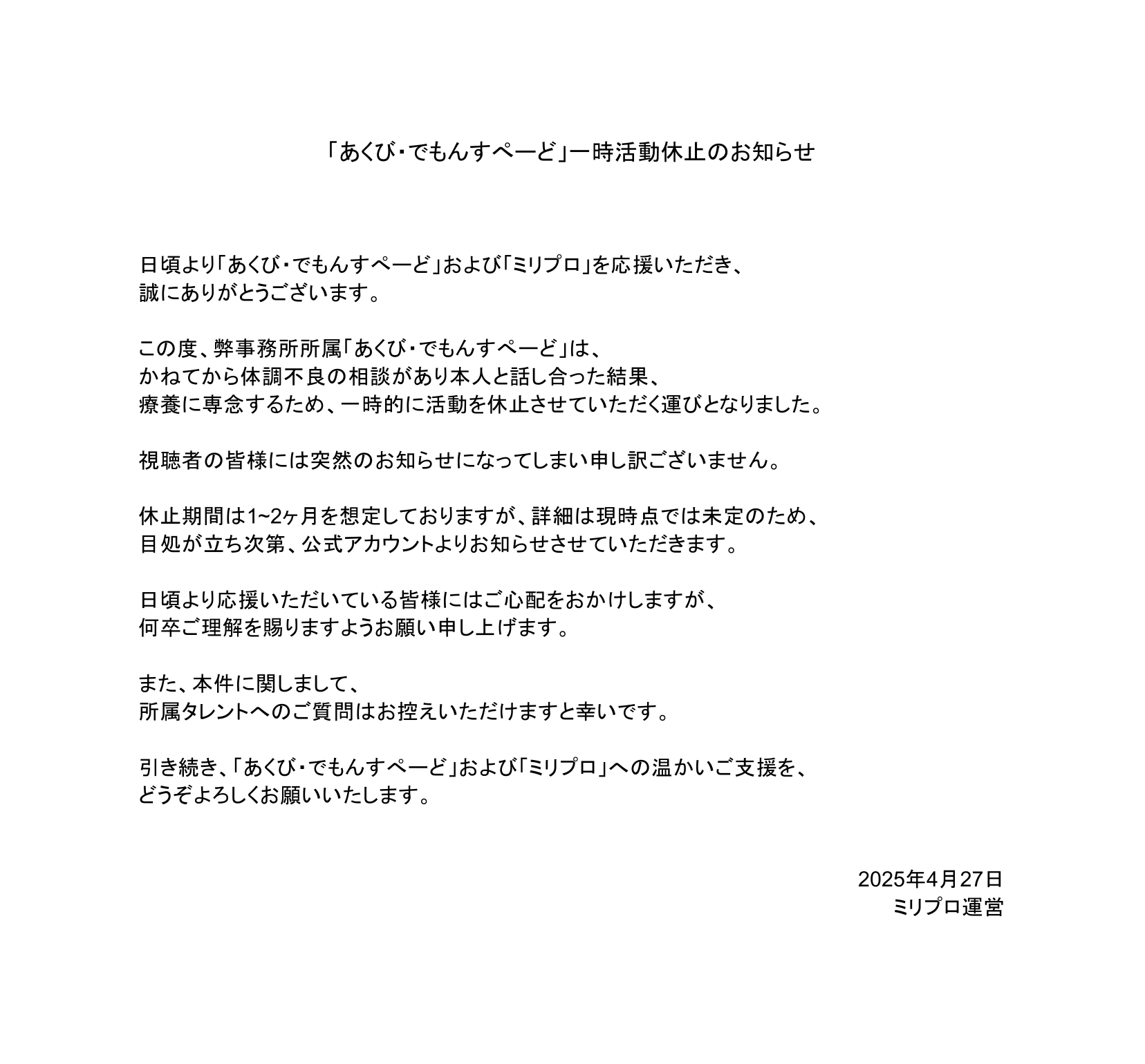 【所属タレント 一時活動休止のお知らせ📝】 pic.twitter.com/9frLvijdeu