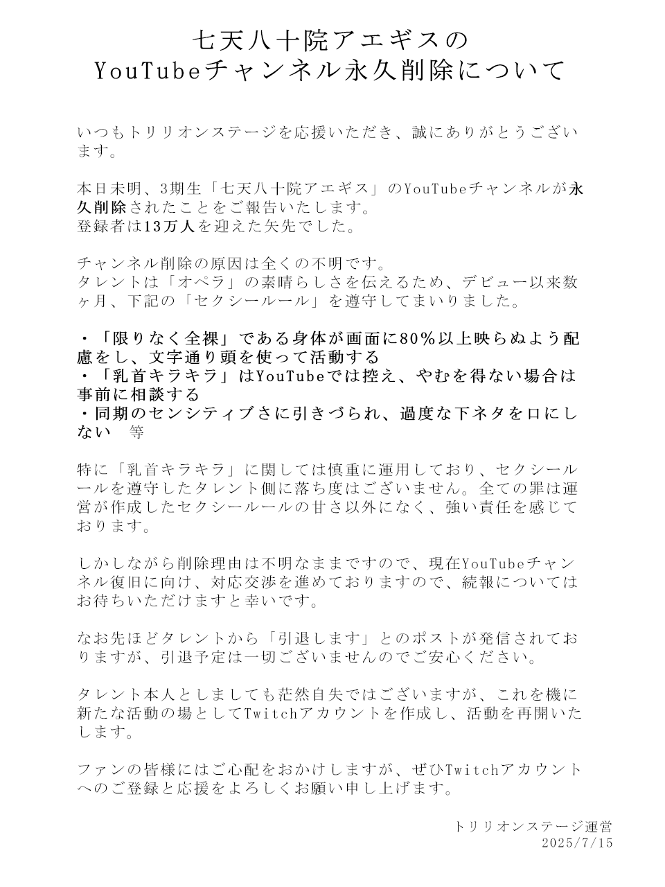 【悲報】登録者13万人の人気Vtuberさん、チャンネルBANされ引退か…収益120万円がすべて消える