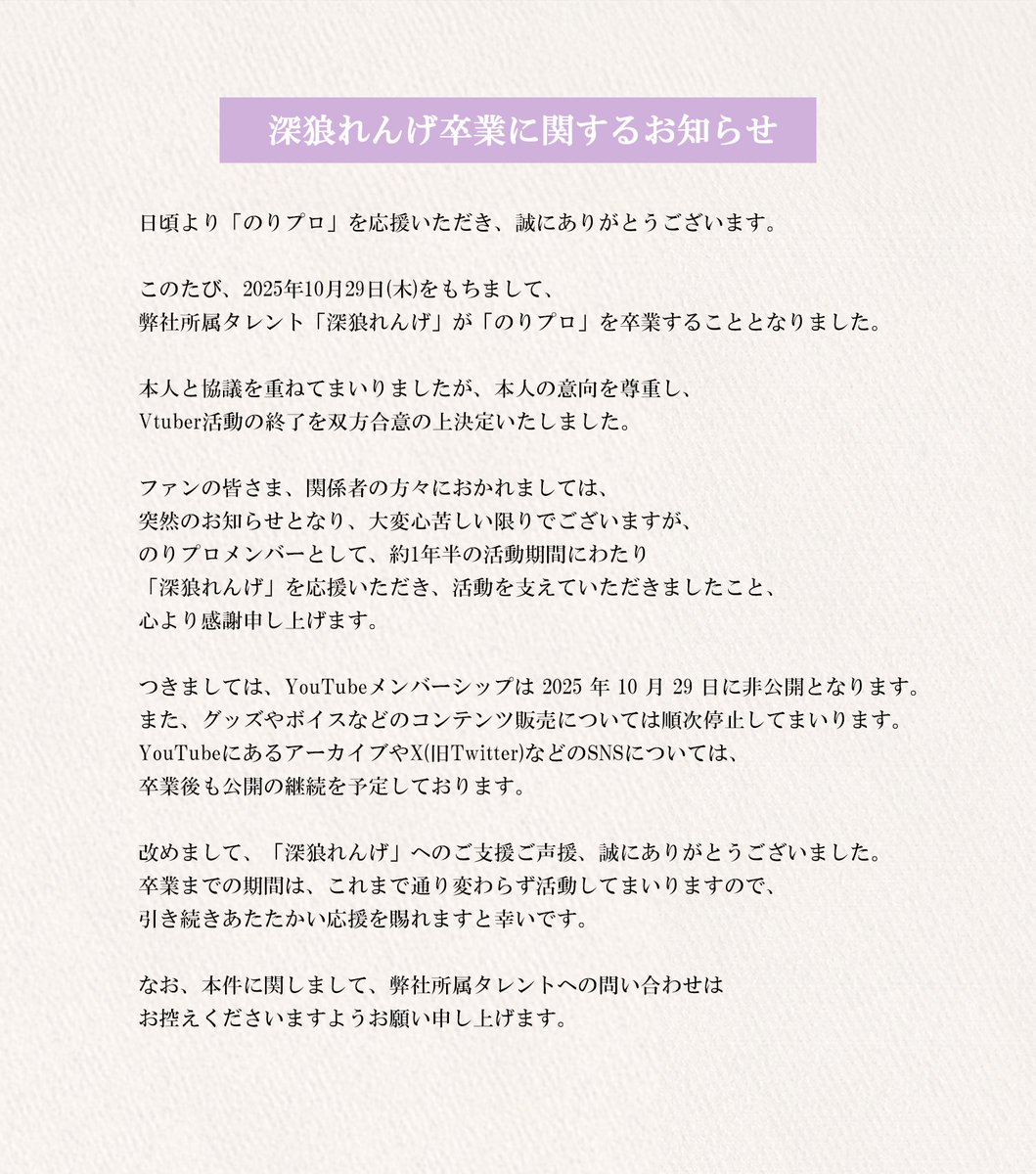 「本人と協議を重ねてまいりましたが、本人の意向を尊重し、 Vtuber活動の終了を双方合意の上決定いたしました。」