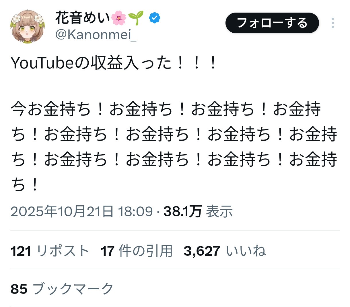 投げ銭とかグッズがどうかわからんけどvじゃない普通のYouTuberがそれくらいのラインの登録者数と再生数で晒してる収益が20万円ぐらいだった