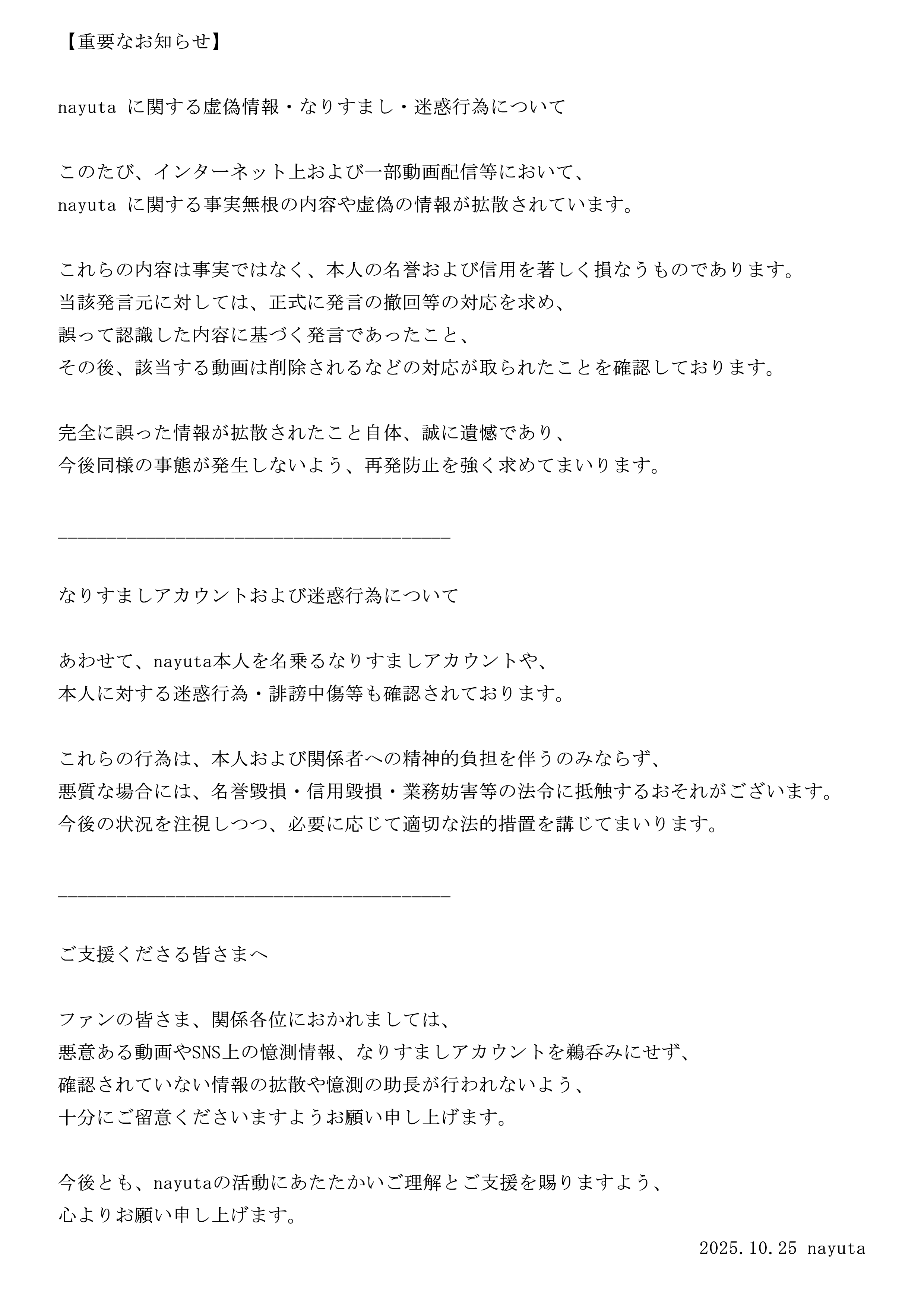 nayutaに関する虚偽情報・なりすまし・迷惑行為について pic.twitter.com/7lqpcJSQ8n— nayuta (@7utauta) October 25, 2025