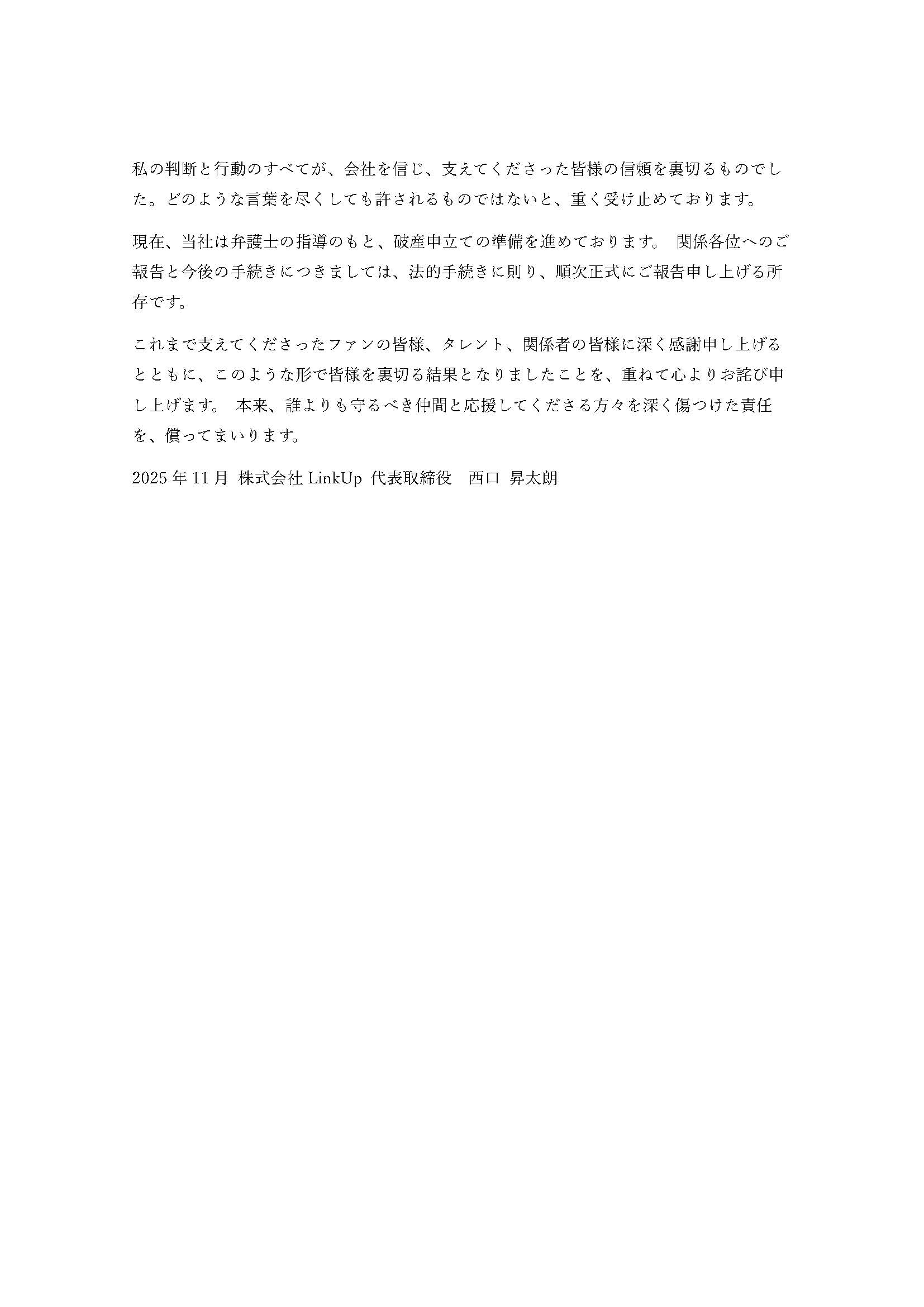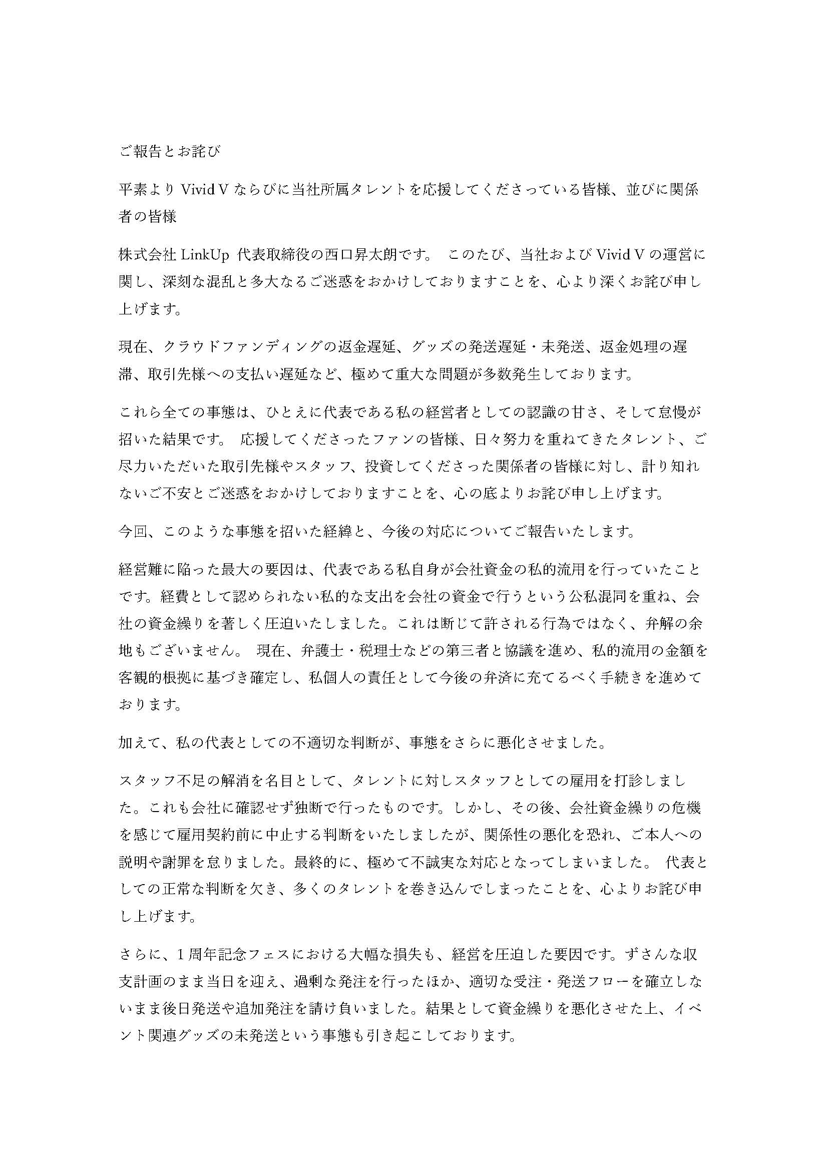 「経営難に陥った最大の要因は、代表である私自身が会社資金の私的流用を行っていたことです。経費として認められない私的な支出を会社の資金で行うという公私混同を重ね、会社の資金縦りを著しく圧迫いたしました。これは断じて許される行為ではなく、弁解の余地もございません。」