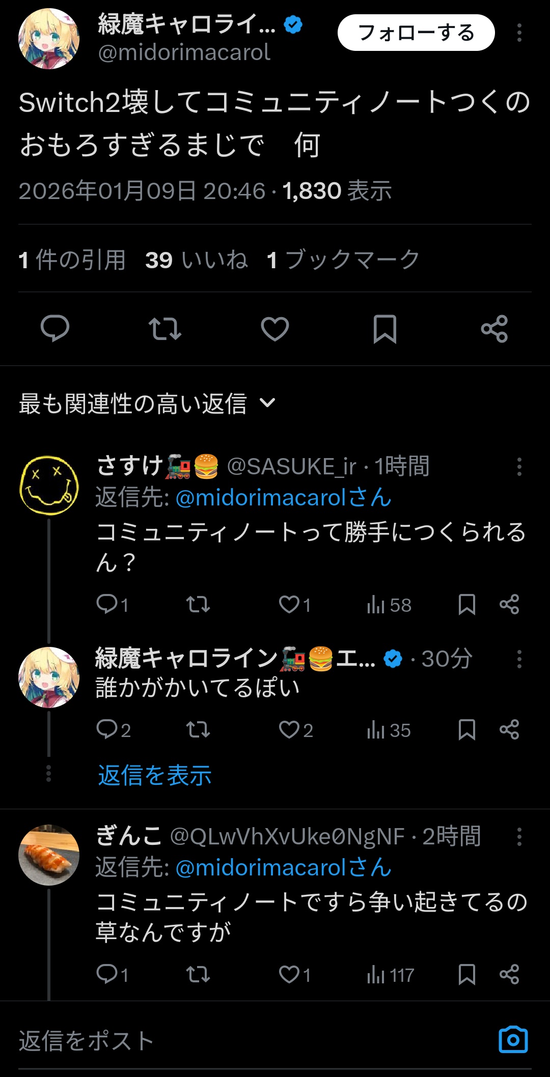 突然任豚がシュバってきてコミュニティノートを書かれて罵倒される模様