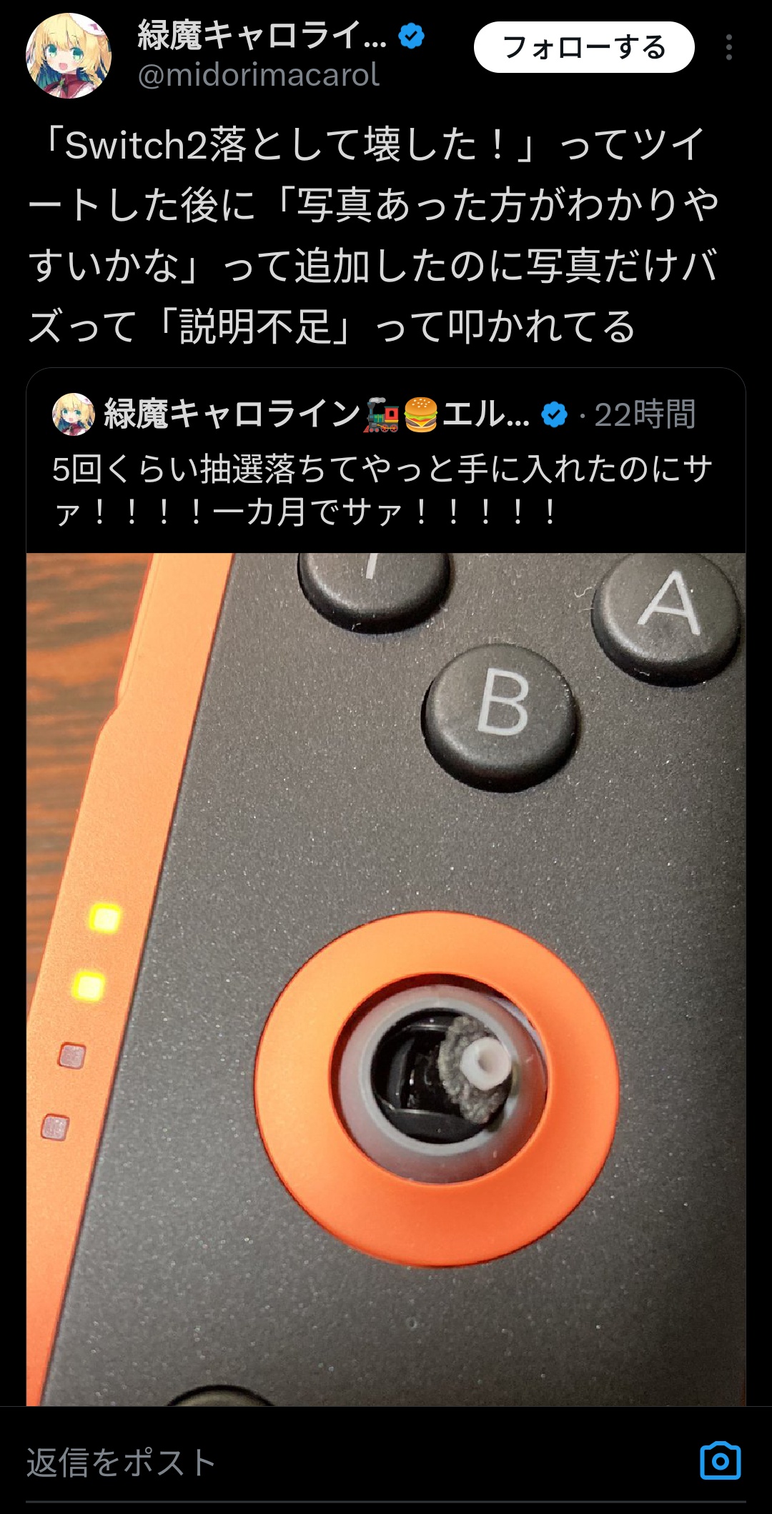 修理系YouTuberもSwitchのときには見かけなかったのにSwitch2でやたらスティック折れが見つかるって言われてる模様