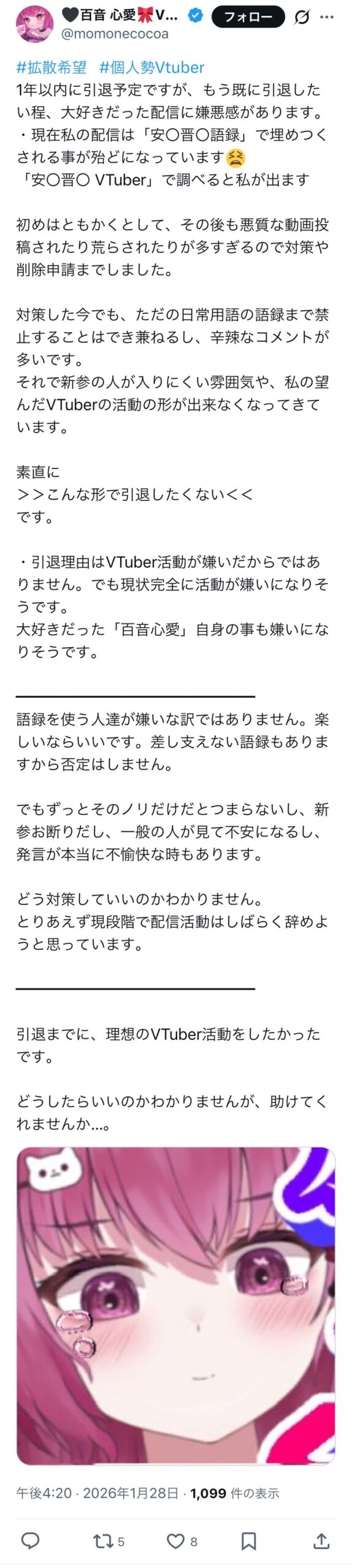 「安〇晋〇 VTuber」で調べると私が出ます… pic.twitter.com/t3qF4mrS2i— 🖤百音 心愛🎀 (@momonecocoa) January 28, 2026